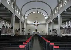 The church of Bintaran was founded by H. van Driessche to accommodate the increasing number of Catholics in Yogyakarta as Kidul Loji Church could not accommodate them anymore. It was designed by J.H. van Oten BNA and the construction was executed by Hollandsche Beton Maatschappij in 1931 on the Kampementstraat (now Bintaran Kidul).[3] The church was designed by Father H. Van Driessche and Mr. Dawoed specifically for the Javanese people, as Javanese people at that time were not used to attend religious ritual in a Western-style building (e.g. sitting on bench, long narrow room) because of the fabric they used. St. Joseph Church of Bintaran is 36 meters by 20 meters long, and the height is 13 meters. The church is white following the color of the surrounding buildings. The mass bench is only located at the back side, where the Europeans and Javanese upper class usually sat. The front part of this are mattress made of bamboo for the Javanese mass service to sit upon. Sun light enters the room through 72 double roosters instead of windows.[4]