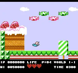 The game uses a health meter to monitor the player's remaining life which can be replenished by obtaining bottles of milk scattered throughout the levels. A heart icon can also be obtained, increasing the maximum health by one unit for the duration of the current world.