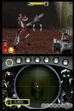 The Nintendo DS version of Bionicle Heroes is a first-person shooter.[5][6] Like other DS first-person shooters, the game can be controlled entirely with buttons or with a mix of button and touchscreen controls,[5] with the directional pad being used to walk and the touchscreen being used to aim.[6] Defeating enemies results in them crumbling into bricks.[6] These bricks can be used to fill the player's Hero Mode charge meter. When filled, the player's gains temporary invincibility and a boost to the power of weapons.[7] The game features two modes: a single-player campaign and an offline multiplayer mode.[5][6]