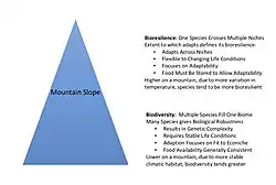 Understanding of bioresilience evolved from research led by The Mountain Institute when establishing two of the national parks that surround Mount Everest, Makalu-Barun National Park in Nepal, and Qomolangma National Nature Preserve in the Tibet Autonomous Region of China.[4] The research documented greater biodiversity at Everest's base than higher up. There were progressively fewer documented species as the mountain ascended into higher biomes, from subtropical to temperate to alpine to Arctic-like. These fewer species, though, had greater biologic robustness correlating directly with increasing bioresilience.[5]