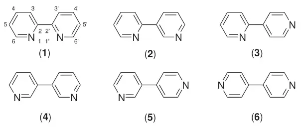 The six possible regioisomers of bipyridine: (1) 2,2′-bipyridine; (2) 2,3′-bipyridine; (3) 2,4′-bipyridine; (4) 3,3′-bipyridine; (5) 3,4′-bipyridine; (6) 4,4′-bipyridine