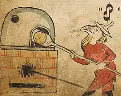 In addition to the full-page miniatures, 33 pages in the manuscript have illustrations in the margins.[10] These illustrations, which closely follow the text,[15] depict Jewish men and women performing Passover and Seder practices, and also reenacting events in Jewish history.[9][10][16] The Passover and Seder-themed reenactments include the roasting of the Paschal lamb; the baking of matzos; grinding the bitter herbs; eating the bitter herbs with charoset; leaning on one's left side at the Seder; breaking the middle matzo, and so on.[3][17] Historical depictions include the Binding of Isaac; the Jewish people hurriedly leaving Egypt with their matzos, which did not have time to rise; Pharaoh and his army pursuing the Jewish nation to the Red Sea; Moses receiving the two Tablets of Stone from heaven and giving over the Pentateuch to the Jewish people; and the Jews receiving manna from heaven during their wanderings in the desert.[3][18][19][20]