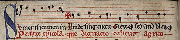 Composers have a variety of bird sounds to work with, from actual birdsong and calls to the appearance and movements of birds, whether real, fictional (like the phoenix) or indeed mechanical. They can choose to use these materials literally, imitating their sounds, as when Sergei Prokofiev uses an oboe for the quacking of a duck in Peter and the Wolf; it may represent the birds symbolically; or it may give a general impression, as when Vivaldi paints a picture of birds moving and singing in The Four Seasons.[4] Two especially popular birds are the nightingale and the cuckoo.[4] The nightingale's song has been used by composers including Handel, who quoted it in the aria "Sweet bird" in L'Allegro, il Penseroso ed il Moderato, in the "Nightingale chorus" in Solomon, and in his Organ Concerto "No. 13", known as "The Cuckoo and the Nightingale". It appears in Rameau's opera Hippolyte, Respighi's The Birds and Beethoven's Third Symphony. Nightingales can also be found in works by Glinka, Mendelssohn, Liszt, Balakirev, Grieg, Granados, Ravel, and Milhaud.[4] The cuckoo's distinctive call is used in the 13th-century English "Sumer is icumen in", probably the earliest instance of a birdcall in musical notation.[7][8] In 1650, Athanasius Kircher represented the calls of several birds in musical notation in his encyclopedic Musurgia Universalis.[9]