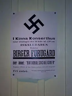 Birger Furugård (8 December 1887 – 4 December 1961) was a Swedish politician and veterinarian. He hailed from Deje in Värmland. During the 1920s Furugård became inspired by the advance of Nazism in Germany. He made several trips to Germany, and met with Adolf Hitler, Hermann Göring and Heinrich Himmler. In 1924 Furugård, together with his two brothers Gunnar and Sigurd, founded the Swedish National Socialist Freedom League. The following year the group was converted into the Swedish National Socialist Peasants and Workers Party. In 1930 Furugård's party merged with the National Socialist People's Party of Sweden and formed the New Swedish National Socialist Party. Furugård became Riksledare (National Leader) of the party. Soon, the party changed its name to Swedish National Socialist Party (SNSP).[1]