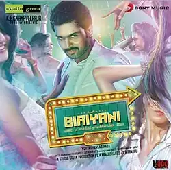 Biriyani is the soundtrack album, composed by Yuvan Shankar Raja, to the 2013 black comedy film of the same name, directed by Venkat Prabhu starring Karthi, Hansika Motwani, Premgi Amaren and Mandy Takhar. It is the 100th album of Yuvan Shankar Raja.[1] In this album, there are 6 songs and two remixes with lyrics written by Gangai Amaran, Vaali, Madhan Karky, Psycho.unit, Gaana Bala, Tanvi Shah and Yuvan Himself. The film also features Karthi, its protagonist, debuting as a Playback singer. After multiple postponements, the soundtrack album was released on 21 August 2013.[2]