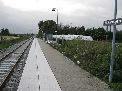 Birk Centerpark railway halt is a railway halt serving the district of Birk in the eastern part of the city of Herning in Central Jutland, Denmark.[1][2] The halt serves several businesses, educational institutions and a residential area for students in the eastern part of Herning.