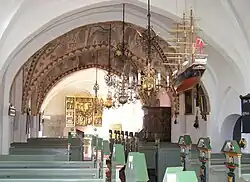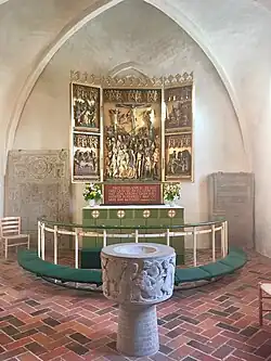The altarpiece dates from the late 15th century and was probably imported from North Germany. It was restored in 1899 and reinstalled in the church as a replacement for a later altarpiece painted by Gustav Theodor Wegener (1817–1877) which can now be seen in the north chapel. The pulpit is from circa 1600 and features King Christian IV's monogram. The five arched niches feature Christ and the four apostles.[5]