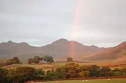 Birkerthwaite, viewed from high ground with Green Crag in the background. | |