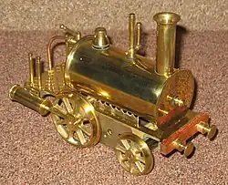 The steam locomotives were very simple, usually made in brass, with a pair of simple oscillating cylinders driving the main wheels. They were basically a boiler mounted on wheels, although simple decoration (usually bands of lacquer) was sometimes applied. Track was not used – the boiler was filled with water, the burner lit, and when steam was being produced, the locomotive was placed on the floor and allowed to run until either the water or fuel ran out or the engine crashed into the furniture. Very quickly, after a number had exploded, simple safety valves were fitted.