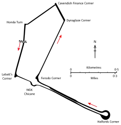 From this area the circuit headed south to cross the southern portion of Birmingham's ring road, the A4540 road, before it turned left and then headed east on a minor collector road. After approximately 180 m (200 yd), cars took the southern part of the Belgrave Interchange roundabout as a right-left-right chicane, before following the slip road to drop down on to the south side (normally westbound lane) of the A4540 Belgrave Middleway dual carriageway. This continued as an undulating and slightly curved straight for around 650 m (710 yd) until the cars arrived at the Haden Circus roundabout, named Halfords Corner after the title sponsor. Here, a large proportion of the centre of the roundabout island had been flattened and surfaced with tarmac forming a broad pan, reducing the radius of the hairpin corner significantly, but the slightly dished profile of the roundabout itself remained resulting in a significant hump as cars entered the corner's braking zone.