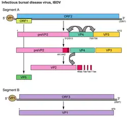 The large RNA segment, segment A, of birnaviruses codes for a polyprotein (N-VP2-VP4-VP3-C) [5] that is processed into the major structural proteins of the virion: VP2, VP3 (a minor structural component of the virus), and into the putative protease VP4.[5] VP4 protein is involved in generating VP2 and VP3.[5] recombinant VP3 is more immunogenic than recombinant VP2.[6]