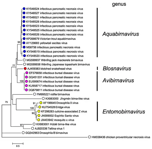 - ^ Delmas, B; Attoui, H; Ghosh, S; Malik, YS; Mundt, E; Vakharia, VN; Ictv Report, Consortium (January 2019). "ICTV virus taxonomy profile: Birnaviridae". The Journal of General Virology. 100 (1): 5–6. doi:10.1099/jgv.0.001185. PMID 30484762.