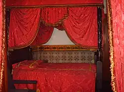 At the time of Bolívar's birth, the home was opulently furnished with mahogany chests and tables, upholstered chairs, decorated mirrors; damask curtains, gold cornices, and bright chandeliers.[4] Period furniture and artifacts belonging to Bolívar can now be seen in the building. The house has a sequence of courtyards surrounded by corridors and rooms. In the main courtyard is the baptismal font used for Bolívar's baptism, originally located in Caracas Cathedral.[10] The second courtyard serves as ventilation to the kitchen and other rooms, and includes a replica of a water fountain from the time of Bolívar. At the end of the house is a small pen-laundry and stable.