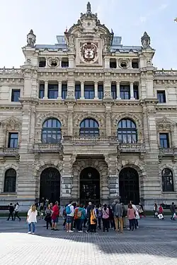 The Bizkaia Delegation Palace is an eclectic mansion in the Ensanche area of Bilbao, Spain. It's the seat of the executive branch of Government of Biscay, the legislative assembly meets in Gernika. The Biscay Palace of the Foral Deputation (also known as simply The Foral Palace), located at 25 Gran Vía, Bilbao, is a free-standing rectangular building, of solid and majestic appearance. Designed by the architect Luis Aladrén Mendivil, it is considered “a pinnacle work of Alfonsine eclecticism” in Vizcaya. It was built between 1890 and 1900 by the Gran Vía de Don Diego López de Haro avenue.