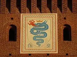 The biscione remained associated with the Duchy of Milan even after the Visconti line died out in the 15th century.[4] The House of Sforza incorporated the symbol into their armorial after taking the duchy.