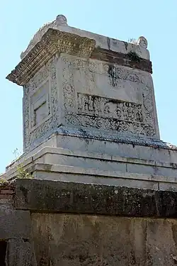 The image of an honor was frequently placed on a tomb of the biselliarius, often with an epitath recording the honor bisellii award (unlike the curule seat or fasces, images of which on the tomb were never accompanied by text).[10] A small group of reliefs includes a wreath resting on the bisellium with unclear meaning.[11]