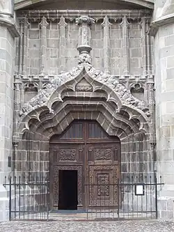 Several octagonal pillars, redesigned at least once during the building process, were probably completed around 1444.[12] One of them features the inlaid crest of military leader John Hunyadi, who is mentioned among the church benefactors.[13] The most intense work took place before and after 1450, and involved completing the exceptionally large number of portals, including the northern "Golden Gate" and its adjacent altar of the Holy Sacrifice.[13] The eastern portal, commissioned by the Hungarian King Matthias Corvinus, was completed in 1476.[14] The vestry was enlarged at some point between 1500 and 1515.[15]
