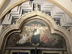 A partly destroyed mural, which appears to have been completed around 1477, is situated near the southeastern portal, and features the coat of arms of Matthias Corvinus and his wife Beatrice.[27] It shows the Nativity, together with depictions of Saint Catherine and Saint Barbara.[27] Unlike the inner Annunciation mural, which is late Gothic, the outside painting is heavily influenced by the Renaissance.[27]
