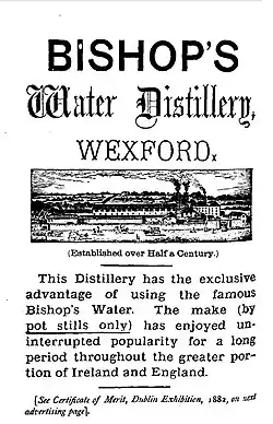 Bishop's Water Distillery was an Irish whiskey distillery which operated in Wexford, Ireland between 1827 and 1914.[3] The distillery was named for a stream which ran along the back of the distillery, the Bishop's Water, said to possess "various occult properties derived from the blessings of the sainted Bishop of Ferns".[4][1][5]