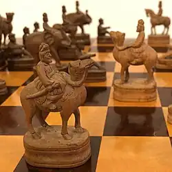 The bishop's predecessor in medieval chess, shatranj (originally chaturanga), was the alfil, meaning "elephant", which could leap two squares along any diagonal, and could jump over an intervening piece. As a consequence, each fil was restricted to eight squares, and no fil could attack another. The modern bishop first appeared shortly after 1200 in Courier chess.[11] A piece with this move, called a cocatriz or crocodile, is part of the Grande Acedrex in the Libro de los juegos compiled in 1283 for King Alfonso X of Castile. The game is attributed to "India", then a very vague term.[12] About half a century later Muḥammad ibn Maḥmud al-Āmulī, in his Treasury of the Sciences, describes an expanded form of chess with two pieces moving "like the rook but obliquely".[13] The bishop was also independently invented in Japan at about the same time (the 13th century), where it formed part of sho shogi and dai shogi; it remains present in modern shogi as the direct descendant of sho shogi.