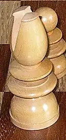 The canonical chessmen date back to the Staunton chess set of 1849. The piece's deep groove symbolizes a bishop's (or abbot's) mitre. Some have written that the groove originated from the original form of the piece, an elephant[22][23] with the groove representing the elephant's tusks.[24] The English apparently chose to call the piece a bishop because the projections at the top resembled a mitre.[25] This groove was interpreted differently in different countries as the game moved to Europe; in France, for example, the groove was taken to be a jester's cap, hence in France the bishop is called fou (jester) [26] and in Romania nebun (meaning crazy, but also jester).[27]