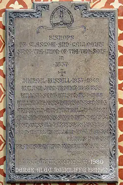 The bishops of the combined See of Glasgow and Galloway[2][3] are listed on two plaques on the south wall of the chancel in St Mary's Cathedral. As the first plaque was filled recording the episcopate of Bishop Rawcliffe, a second plaque was installed following the enthronement of Bishop Taylor.