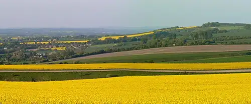 Bishopstone lies at the western end of the Vale of White Horse. The parish was on the county boundary with Berkshire until 1974, when the Vale was transferred from Berkshire to Oxfordshire.[2] The village retains the former millpond, and is characterised by ancient lanes which are narrow and winding.[3]
