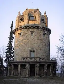 A Bismarck tower (German: Bismarckturm) is a specific type of monument built according to a more or less standard model across Germany to honour its first chancellor, Otto von Bismarck (d. 1898). A total of 234 of these towers were inventoried by Kloss and Seele in 2007[1] but more have been discovered since making the total around 240.[2][3] These towers were built between 1869[4] and 1934 and some 173 remain today.[1][5] Quite a few of these towers, including all 47 based on Wilhelm Kreis's Götterdämmerung design,[6] were built as so-called Bismarck Columns (Bismarcksäulen) or were converted into them. This description goes back to the Student Union's competition held in 1899,[7] which was to encourage the erection of as many beacons as possible (and not observation towers). But other Bismarck towers, e.g., those that were purely beacons with no observation function, were often called Bismarck columns.