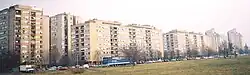 The first buildings outside of the Satelit neighborhood were constructed in Bate Brkića street (today's 18-26 street numbers) by the Neimar enterprise (which would be responsible for most of the building construction in the coming decades). Those first high rises were wide buildings, with 8 stories of residential apartments as well as space for local shops, craftsmen, merchants and lodges.[7]