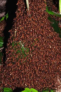 A bivouac is an organic structure formed by migratory driver ant and army ant colonies, such as the species Eciton burchellii. A nest is constructed out of the living ant workers' own bodies to protect the queen and larvae, and is later deconstructed as the ants move on.[1][2]