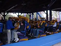 | Trains | 3 trains with 8 cars. Riders are arranged 4 across in a single row for a total of 32 riders per train. |