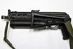 One of the Bizon's more unusual features is the magazine, which is often mistaken for a grenade launcher.[4] The cylinder below the barrel is in fact a 64-round helical-feed magazine, similar to the type used in the American Calico M960 submachine gun.[4]