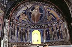 The interior of the church contains two separate sets of medieval murals. Decorating the apse is a set of vivid Romanesque paintings, influenced by French art and made in the early 13th century but somewhat harshly restored in the 19th century. They depict God holding the crucified Christ within a mandorla, under which the Apostles are standing. On the side walls there are scenes from the Old and New Testament as well as the family tree of Jesus. The paintings adorning the vaults of the nave are from the 14th century and depict the Coronation of the Virgin and the former patron saint of the church, Saint Lawrence.[1][2][3]