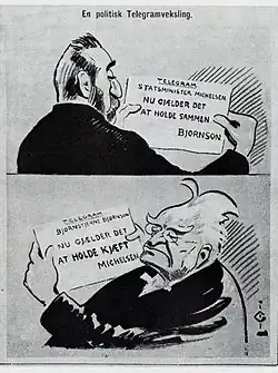 When Norway was attempting to dissolve the forced union with Sweden, Bjørnson sent a telegram to the Norwegian Prime minister stating, "Now is the time to unite." The minister replied, "Now is the time to shut up."[3] This was in fact a satirical illustration published in Vikingen, but the story got so popular and widespread that Bjørnson had to deny it, claiming that "Michelsen has never asked me to shut up; it would not help if he did".[16]