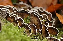 In a 1913 survey of polypore genera, Adeline Ames included B. adusta, B. fumosa, and B. puberula;[3] the latter fungus is now placed in Abortiporus. Marinus Anton Donk included only B. adusta and B. fumosa in a 1974 publication.[4] Some authors have suggested to merge these two species into other genera, such as Gloeoporus, Tyromyces, or Grifola.[2] Molecular phylogenetic analysis has demonstrated that the two traditional Bjerkandera fungi form a monophyletic group that is sister to the crust fungus Terana coerulea.[5] The little-known Cuban species B. subsimulans and B. terebrans, both originally described by Miles Berkeley and Moses Ashley Curtis, were transferred to Bjerkandera by William Alphonso Murrill in 1907,[6] and are accepted as valid species by Index Fungorum. Bjerkandera atroalba and B. centroamericana are two neotropical species that were transferred to Bjerkandera, and described as new, respectively, in 2015.[7] In 2021 four new species were added from South America and Asia.[8]
