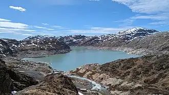 Blådalsvatnet is a glacial lake in the municipality of Kvinnherad in Vestland county, Norway. The 2.89-square-kilometre (1.12 sq mi) lake lies just outside the Folgefonna National Park, about 10 kilometres (6.2 mi) north of the village of Indre Matre. The lake is formed by the glacial runoff from the large Folgefonna glacier located just north of the lake. The lake is part of the water system used to power the Blåfalli kraftverk hydroelectric power station.[1]