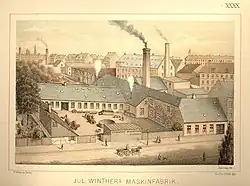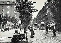 The so-called Demarcation Line which restricted the construction of buildings in the area was moved from Jagtvej to Peblinge Lake in 1852 and the street received its current name in 1859. The teacher training college Blaagaard Seminarium was founded in rented rooms in Blågårdsgade in 1859 and a purpose-built building was inaugurated at No. 15 in 1863. The street was first built over with lower and more scattered buildings but with taller apartment blocks in the 1880s. The street was part of a working-class neighbourhood and also developed a city-wide reputation as a shopping street.[1] The city acquired the iron foundry site in 1898 and established Blågårds Plds to improve the area. Tram line No. 3 operated through the street in both directions between 1906 and 1949.