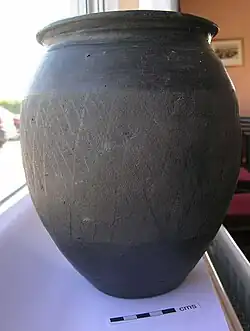 Black Burnished Ware Category 2 (BB2) is greyer in color and has a finer texture when compared with BB1.[4] It is a “hard, sandy fabric, varying in colour from dark-grey or black with a brown or reddish brown core and a reddish-brown, blue-grey, black or lighter ('pearly grey') surface.”[5] The clay body can contain black iron ore, mica, and quartz, all in a matrix of sediment.[5] These wares are thrown on a fast potter's wheel.