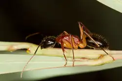Workers use several social techniques during colony movements to other nest sites or to lead others to food sources, which includes a worker carrying another worker, tandem running or laying down a pheromone trail for orientation.[23] They are also attendants to the butterflies Ogyris idmo and Ogyris genoveva.[24][25][26] The larvae will reside in underground areas constructed by attending ants, and during the night they will emerge with them and feed on mistletoe leaves.[27] The species is tolerant to myrmecophiles; the beetles Ctenisophus morosus and Cryptodus paradoxus have been found in nests, and the wingless cricket Myrmecophilus australis also dwells inside colonies.[28][29][30] Other insects which dwell inside nests include froghoppers in the family Cercopidae.[31]