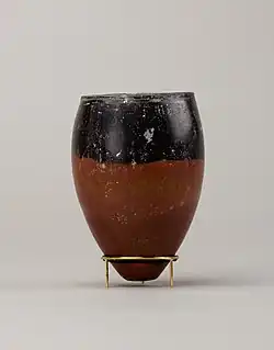 Black-topped pottery is a specialized type of Ancient Egyptian pottery that was found in Nubian archaeological sites, including Elephantine, an island on the Nile River, Nabta Playa in the Nubian Desert, and Kerma in present-day Sudan. This type of artifact dates predominantly to the Predynastic Period, but “a handful of examples made in the Early Dynastic Period are known to exist.”[1] These vessels were used “exclusively for ritual and funerary purposes[1] and were discovered in ancient cemeteries and settlements. The majority of these pots are variations of the Egyptian hes-jar form and feature red bodies with black tops and interiors.[1] The red color is derived from the natural iron that occurs within Nile silts which oxidizes upon firing, and the black top and interior is a product of reduction firing and carbon smudging.[2]