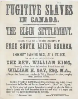 Josiah Henson came to Canada with his wife and four children and founded the Dawn settlement in a rural area near Dresden in 1841. Settlers worked cooperatively to help one another, benefiting from one another's skills. They farmed and operated grist and saw mills and businesses, like rope manufacturing and brick making. The British American Institute was a traditional and vocational school. The Elgin settlement was settled at Buxton near Chatham by Rev. William King, who had been a slaveholder, and 15 of his former enslaved people in 1849. He was a Presbyterian minister who settled in southern Ontario. The Buxton settlement became known for its school. There were 2,000 residents by the 1860s.[3] Another all-Black community in Ontario was Queen's Bush.[1]