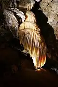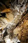 Black Chasm was likely known about by the local Miwok tribes, though gold miners were the first credited with exploring the cave in 1854. The miners described the cave as having "...vaulted chamber[s] large enough to contain the largest trees..." and "... crystals [that] stood out from the walls in every conceivable direction, turning and bending into many shapes...".[2] These turning and bending formations are known as helictites and are an unusual formation in cave systems throughout the world. Somewhere near the 1860s, the cave entrance was enlarged from its original 18" wide crack in order to accommodate stairs for tours. The tours lasted only a short time before the cave was abandoned.[3]