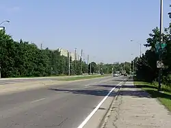 Black Creek Drive forms the southerly extension to Highway 400, and was originally intended as part of a proposed freeway that would have connected Highway 401 with the Gardiner Expressway, via the Crosstown Expressway.[12] A piece of a larger plan to expand a network of expressways across Toronto, the route was instead completed as a compromise between Metropolitan Toronto and the provincial government, as part of the larger Spadina Expressway controversy.[13][14] The goal of Metro Toronto was to establish a network of expressways across and into Toronto, including the Crosstown Expressway north of Dupont Street, and the Richview Expressway along Eglinton Avenue West.[15][16] Plans were conceived to extend Highway 400 south from Highway 401 to Eglinton Avenue, where it would join those two new expressways.[17] These plans would never reach fruition, as public opposition to urban expressways cancelled most highway construction in Toronto by 1971.[18]