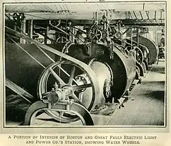 Ownership of the dam changed twice in the second decade of the 20th century. In 1908, John D. Ryan (president of the Daly Bank and Trust Co. in Butte and the Anaconda Copper Company, and a future Assistant Secretary of War)[66] purchased most of the shares in the GFWPTC.[67] In 1910, GFWPTC organized a subsidiary, the Great Falls Power Co., to take over ownership and operation of Black Eagle Dam and its other hydroelectric properties (then being built).[31][6] A second ownership change occurred in 1912. Cost overruns on Holter Dam, waning investor enthusiasm for dam-building, and the liability associated with the collapse of Hauser Dam nearly drove Samuel Thomas Hauser, the largest shareholder in the United Missouri River Power Company (owner of Hauser and Holter) into bankruptcy.[68][69] Hauser sold his interest in United Missouri River Power to John D. Ryan, who on October 25, 1912, merged United Missouri River Power with the Great Falls Power Co., Butte Electric and Power Company, Billings and Eastern Montana Power Company, and Madison River Power Company to form the Montana Power Company.[69][70] That same year, most of Black Eagle Dam's power (3.9 MW to 5.7 MW) was delivered to the new smelter.[31] In comparison, only about 0.7 MW was delivered to the nearby city.[31] Another 300 horsepower of mechanical energy was created by a water wheel and delivered physically, through a rope and pulley system, to the Royal Milling Co.[31]