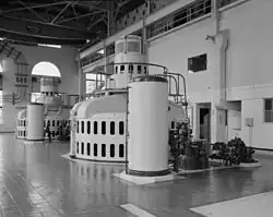 The dam's new powerhouse was concrete. The company had planned to build a brick powerhouse. But local bricklayers demanded that they be paid the salary offered by the city rather than the lower rate offered by Montana Power.[45] The company refuse to hire the workers, and built the structure of concrete instead.[45] Concrete and masonry retaining walls north and south of the powerhouse were also built to help prevent erosion of the riverbank into the forebay and tailrace.[45] The new forebay was 421 feet (128 m) long and 96 feet (29 m) wide.[10] The forebay was slightly extended downstream to the new powerhouse, and brick arches of the old powerhouse incorporated into the forebay's walls.[45] The new powerhouse contained three vertical Kaplan turbines (supplied by the S. Morgan Smith Company)[6][10] capable of generating 18 MW of power,[6][10] which gave Black Eagle the largest generating capacity of any of Montana Power's five dams in the Great Falls area.[76] The Smith company also made the oil-pressure governors (which regulated each turbine's speed) and draft tubes (which slowed the water down as it left the turbine, allowing the faster-moving water above to keep imparting energy to the turbine's propellers).[6] The scroll-shaped inlets and wicket gates around the turbines were cemented into the powerhouse's basement, and each turbine installed in its own pit.[6] Each turbine connected through the first floor roof to an Allis-Chalmers generator rated at 7,000 kVA.[6] DC generators acted as exciters for the Allis-Chalmers generators.[6] Six 6,600/2,200 volt transformers stepped down the power for usage.[6]
