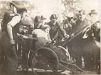 Groups approaching Parliament Square were met at the Westminster Abbey entrance to the square by groups of bystanders, who manhandled the women. As they moved past the men, the suffragettes were met by lines of policemen who, instead of arresting them, subjected them to violence and insults, much of which was sexual in nature. The demonstration continued for six hours; police beat women attempting to enter parliament, then threw them into the crowds of onlookers, where they were subjected to further assaults.[56] Many of the suffragettes considered that the crowds of men who also assaulted them were plain clothes policemen.[57] Caxton Hall was used throughout the day as a medical post for suffragettes injured in the demonstration. Sylvia Pankhurst recorded that "We saw the women go out and return exhausted, with black eyes, bleeding noses, bruises, sprains and dislocations. The cry went round: 'Be careful; they are dragging women down the side streets!' We knew this always meant greater ill-usage."[58] One of those taken down a side street was Rosa May Billinghurst, a disabled suffragette who campaigned from a wheelchair. Police pushed her into a side road, assaulted her and stole the valves from the wheels, leaving her stranded.[59] The historian Harold Smith writes "it appeared to witnesses as well as the victims that the police had intentionally attempted to subject the women to sexual humiliation in a public setting to teach them a lesson".[60]