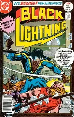 Black Lightning (Jefferson Michael "Jeff" Pierce) is a superhero who appears in American comic book published by DC Comics. The character, created by writer Jenny Blake Isabella with artist Trevor Von Eeden, first appeared in Black Lightning #1 (April 1977), during the Bronze Age of Comic Books.[1] Although his precise origin story has varied over the years, he is generally depicted as a metahuman superhero who uses the ability to generate and control electricity to defend his community – and the world – as Black Lightning. Although not the first black superhero to be featured in DC Comics stories, Black Lightning was DC's first African-American superhero to headline his own series.[2]
