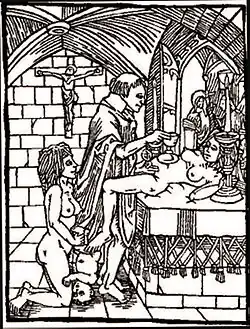 The Catholic Church regards the Mass as its most important ritual, going back to apostolic times. In general, its various liturgies followed the outline of Liturgy of the Word, Offertory, Liturgy of the Eucharist and Benediction, which developed into what is known as the Mass. However, as early Christianity became more established and its influence began to spread, the early Church Fathers began to describe a few heretical groups practicing their own versions of Masses. Some of these rituals were of a sexual nature.[2] The fourth-century AD heresiologist Epiphanius of Salamis, for instance, claims that a libertine Gnostic sect known as the Borborites engaged in a version of the Eucharist in which they would smear their hands with menstrual blood and semen and consume them as the blood and body of Christ respectively.[3] He also alleges that, whenever one of the women in their church was experiencing her period, they would take her menstrual blood and everyone in the church would eat it as part of a sacred ritual.[4] Saint Augustine, also writing in the fourth century, describes a group referred to as "Catharistas" ("purifiers"), who added the mixture of male and female sexual fluids to flour to create a "Sacrament" which they ate, in the belief that they were purifying the substance through eating it.[5]