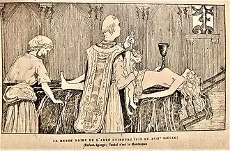 - 17th century: Catherine Monvoisin and the priest Étienne Guibourg performed "Black Masses" for Madame de Montespan, the mistress of King Louis XIV of France. Since a criminal investigation—L'affaire des poisons ("Affair of the Poisons")—was launched (resulting in the execution of Monvoisin and the imprisonment of Guibourg) many details of their Black Mass have come down to us.[11] It was a typical Roman Catholic Mass, but modified according to certain formulas (some reminiscent of the Latin Sworn Book of Honorius, or its French version, The Grimoire of Pope Honorius) and featuring the King's mistress (the Marquise de Montespan) as the central altar of worship, lying naked upon the altar with the chalice on her bare stomach, and holding a black candle in each of her outstretched arms. The Host was consecrated on her body, and then used in love potions designed to gain the love of the King (on account of the magical power believed to be in the consecrated Host). From these images of the Guibourg Mass, further developments of the Black Mass derived.[12]