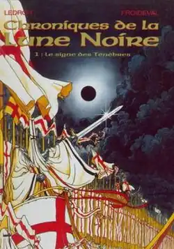 ![]() Volume 1, Le signe des Ténèbres (Sign of Darkness), showing the armies of the Order of Light, led by Fratus Sinister, under the Black Moon (which appears on all album covers). | |
